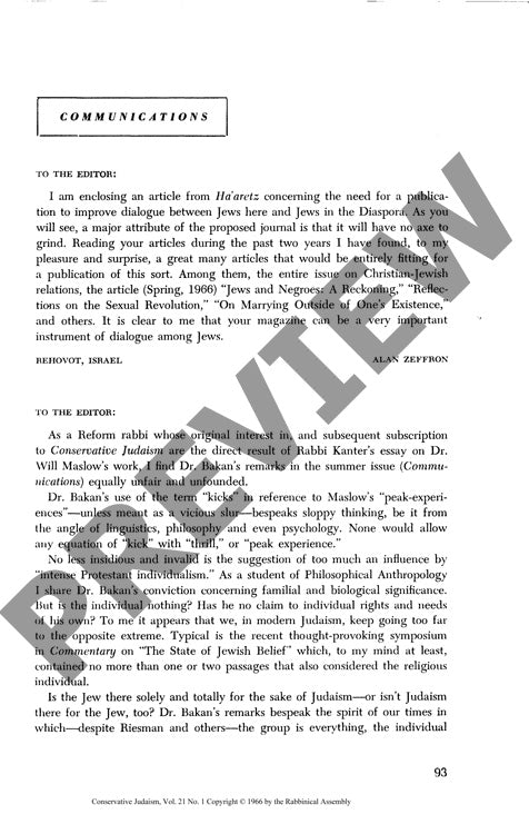 Tensions between communal identity and individual spiritual autonomy continue to shape Jewish intellectual discourse, as revealed through a series of letters to Conservative Judaism's editor. The correspondence illuminates key debates about diaspora dialogue, religious experience, and interfaith relations through qualitative analysis of published materials and comparative theological examination. One letter advocates expanding the journal's role in facilitating Jewish diaspora dialogue, pointing to successful coverage of Christian-Jewish relations and social issues. Another provides substantive pushback against Dr. Bakan's treatment of Abraham Maslow's psychological theories, particularly defending the legitimacy of "peak-experiences" and questioning whether contemporary Judaism has overcorrected toward collectivism at the expense of personal spirituality. Using philosophical and anthropological analysis, this correspondent argues for integrating individual religious experience within Jewish communal frameworks. A final letter offers factual clarification regarding Alfred Lilienthal's connection to The American Council for Judaism. Together, these communications demonstrate how Jewish intellectual circles navigate the complex relationship between traditional communalism and modern individualistic approaches to religious experience, while highlighting Conservative Judaism's potential as a forum for meaningful interfaith and intrafaith dialogue.