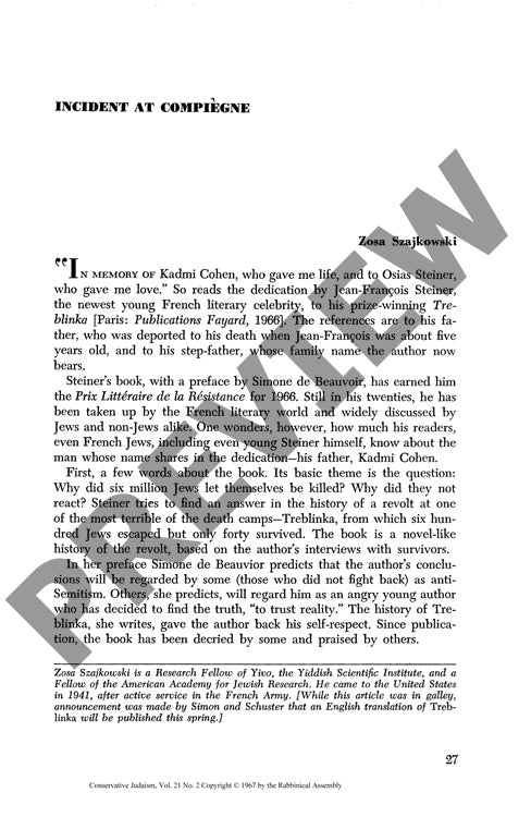In December 1941, as approximately 1,000 Jewish intellectuals faced internment at Compiègne concentration camp, a profound ideological divide emerged between those embracing and rejecting their Jewish identity. At the heart of this tension stood Kadmi Cohen, a Franco-Jewish lawyer whose rare publication "Massada: Discours des Camps de Concentration" and camp lectures challenged the prevailing assimilationist mindset among French Jews. Drawing on camp records, survivor testimonies, and Cohen's published works, this research reveals how Jewish intellectuals maintained opposing ideological stances even within concentration camp walls. The "confiants" - assimilationists who viewed persecution as temporary - continued to prioritize their French identity and sometimes blamed foreign-born Jews for anti-Semitic persecution. In contrast, Cohen's "Massada" club promoted Jewish consciousness and resistance, reflecting broader conflicts between assimilationist and Zionist perspectives in French Jewish communities during 1941-1944. This historical context proves crucial for understanding the later controversial work of Cohen's son, Jean-François Steiner, author of "Treblinka" (1966). The findings suggest that oversimplified narratives about Jewish responses to persecution stem partly from insufficient documentation of these complex ideological struggles during the Holocaust period.