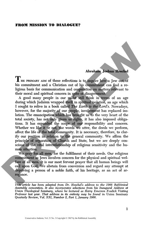 For centuries, Jews and Christians have wrestled with seemingly irreconcilable doctrinal differences, yet their shared spiritual heritage and common contemporary challenges demand a new framework for engagement. Moving beyond traditional missionary approaches, meaningful interfaith dialogue emerges as both a theological imperative and practical necessity. Through philosophical analysis, religious reflection, and historical examination of Jewish-Christian relations, this research reveals how committed believers from both faiths can establish authentic communication while maintaining their distinct traditions. Shared human experiences—fear, moral responsibility, and accountability to God—provide fertile ground for interfaith encounter, even as differences in law and creed pose significant obstacles. As both communities face mounting challenges from secularization and nihilism, mutual support proves more valuable than competitive conversion efforts. The modern ecumenical revolution has created unprecedented opportunities for Jewish-Christian dialogue, provided Christianity abandons missionary activities directed toward Jews. Success requires deep religious commitment from participants and mutual recognition of each tradition's spiritual legitimacy. Such dialogue not only fosters understanding between religious communities but addresses broader spiritual crises affecting modern humanity, establishing a framework for confronting contemporary moral challenges together.