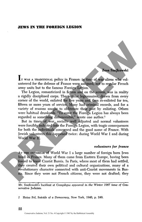 Jewish volunteers who served France faced systematic discrimination through forced assignment to the French Foreign Legion during both World Wars, despite their patriotic motivations and willingness to fight in regular army units. Thousands of Eastern European Jews eagerly enlisted during WWI through organized recruitment centers, inspired by France's historic role as the first nation to grant Jews civil rights. Yet their treatment revealed a stark contradiction between France's democratic ideals and military practices. Drawing from recruitment records, personal testimonies, contemporary press accounts, and the author's own service in the 12th Regiment during WWII, this research documents patterns of prejudice and mistreatment across both conflicts. Jewish legionnaires encountered ridicule from professional soldiers, anti-Semitic officers, inferior equipment, and particularly dangerous assignments. The devastating Battle of Carency in 1915, where approximately 3,100 of 4,000 Jewish volunteers perished, sparked protests and government investigations. During WWII, Jewish refugees again found themselves channeled into Foreign Legion units, facing similar discrimination. Most tragically, many WWII Jewish veterans were later interned in labor camps and deported to concentration camps, despite their military service. While France officially justified these assignments through traditional policies regarding foreign volunteers, the evidence reveals how institutional practices resulted in systematic discrimination that ultimately betrayed both individual Jewish soldiers and France's democratic principles.