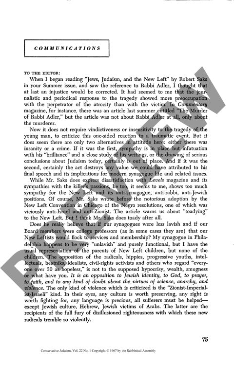 This scholarly correspondence examines the contemporary relationship between Judaism and the New Left movement through an epistolary exchange between Rabbi Jacob Chinitz and Robert Saks. The primary methodology involves critical analysis of journalistic responses to the murder of Rabbi Adler and evaluation of New Left attitudes toward Jewish institutions. Chinitz argues that media coverage disproportionately focused on the perpetrator rather than the victim, and contends that New Left opposition stems from fundamental rejection of Jewish identity, faith, and religious practice rather than mere criticism of institutional hypocrisy or materialism. He challenges Saks' recommendations for synagogue reform, asserting that modest structural changes would not attract New Left adherents to Jewish religious life. Saks responds by clarifying misconceptions about New Left ideology and organization, particularly regarding the Chicago convention's anti-Israel resolutions, arguing that such positions reflected political pragmatism rather than inherent anti-Semitism. The key findings suggest that the conflict between Judaism and New Left activism represents deeper ideological tensions beyond superficial institutional critiques. The correspondence concludes that while synagogue reforms remain necessary independent of New Left concerns, the movement's primary focus lies in civil rights, anti-war activism, and social justice rather than systematic opposition to Jewish religious institutions.