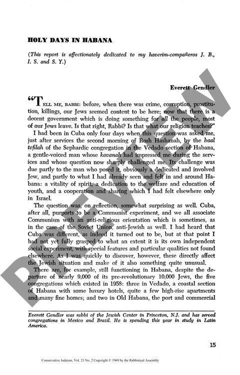 This ethnographic study examines the condition of Jewish religious life in revolutionary Cuba through participant observation during the High Holy Days of 1968. The author conducted field research by visiting all five functioning synagogues in Havana and interviewing community members, religious leaders, and government officials. Despite the emigration of approximately 9,000 of Cuba's pre-revolutionary 10,000 Jews, the research reveals that religious institutions continue to operate with full governmental support and respect. The study documents the organizational structure and religious practices of each congregation, ranging from liberal Reform to Orthodox orientations, and examines community services including Jewish education, kosher food provision, and cemetery maintenance. Key findings indicate that the Cuban revolutionary government has demonstrated exceptional accommodation toward Jewish religious needs, providing special food rations for holidays, maintaining kosher slaughter services, and preserving Jewish educational programs within the nationalized school system. The research reveals a fundamental tension between economic motivations for emigration and religious-ethical considerations regarding social justice, as articulated by remaining community members who view Cuba's egalitarian experiment as consistent with Jewish values. The study concludes that while the community faces numerical decline and institutional challenges, a small core of dedicated Jews perceives the revolutionary period as embodying Jewish principles of social justice and human brotherhood, suggesting the need for continued dialogue between Cuban and American Jewish communities.