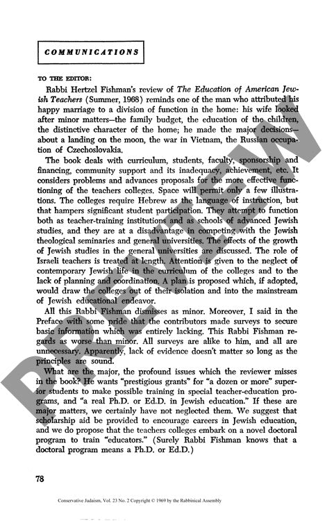 A spirited methodological debate between two prominent Jewish education scholars in America reveals deeper tensions between empirical and theoretical approaches to educational reform. The correspondence, sparked by Rabbi Hertzel Fishman's review of "The Education of American Jewish Teachers" (edited by Oscar I. Janowsky), centers on fundamental disagreements about how best to evaluate and improve Hebrew teachers colleges. Janowsky champions the book's comprehensive survey-based methodology, which examined curriculum, faculty, financing, and community support across eleven accredited institutions, leading to proposed reforms including doctoral programs and enhanced contemporary Jewish studies. Rabbi Fishman counters that mere surveys are insufficient, advocating instead for authoritative institutional evaluations, prestigious doctoral programs, and innovative character education approaches. Their exchange illuminates a broader conflict between descriptive research approaches and prescriptive reform agendas in addressing the acknowledged challenges facing Jewish teacher education institutions in America, highlighting the persistent tension between data-driven analysis and transformative programmatic change.