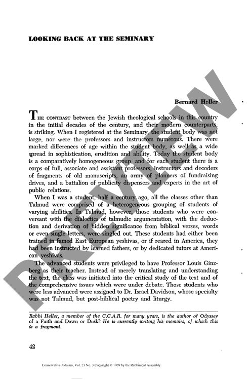 This memoir fragment by Rabbi Bernard Heller examines the transformation of Jewish theological education through a retrospective analysis of the Jewish Theological Seminary during the early twentieth century. Using autobiographical methodology, Heller contrasts the intimate, heterogeneous institution of his student years half a century prior with the expanded, homogeneous seminary of the 1960s. The study reveals significant demographic and pedagogical differences, particularly in the diverse student body composition and specialized Talmudic instruction that characterized the earlier period. Through detailed portraits of faculty members including Louis Ginzberg, Israel Friedlander, Alexander Marx, and Mordecai Kaplan, the analysis illuminates the distinctive teaching methodologies and scholarly approaches that shaped Conservative rabbinical education. The research explores student motivations for pursuing rabbinical careers, revealing that economic incentives were minimal and most candidates were driven by devotion to Jewish learning, peoplehood, or scholarly pursuits rather than divine calling. The findings demonstrate how the Seminary's standardized curriculum, though limited in scope, provided comprehensive grounding in Jewish scholarship through intensive faculty-student relationships. This historical examination contributes to understanding the evolution of American Jewish theological education and the institutional culture that produced a generation of Conservative rabbis who would significantly influence twentieth-century American Judaism.
