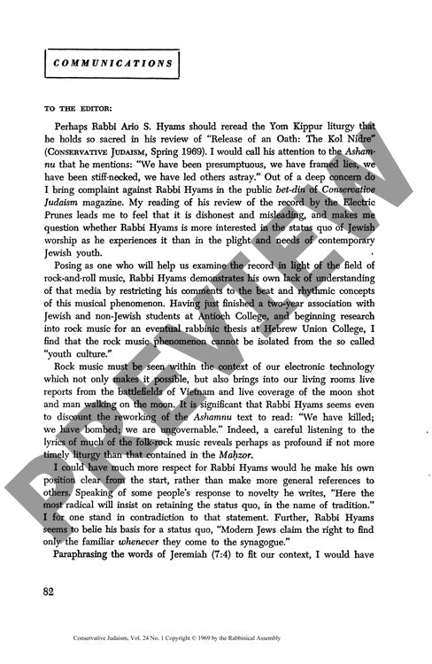 This collection of communications presents diverse perspectives on contemporary challenges facing Conservative Judaism in the late 1960s. The methodology consists of letters to the editor responding to previously published articles on Jewish liturgical innovation, Jewish-Black relations in academia, and halakhic authority. The first communication critiques Rabbi Ario S. Hyams' dismissal of rock music in Jewish worship, arguing that contemporary youth culture and electronic media necessitate liturgical adaptation beyond traditional forms. The author contends that folk-rock lyrics may contain more relevant spiritual content than conventional prayer books. Two subsequent letters address Moshe Ettenberg's essay on Jewish students and Black educational demands, presenting conflicting views on Jewish minority status, university admission policies, and the legitimacy of expanded Black enrollment. One respondent challenges the characterization of Jews as a "weak, exposed minority" while another supports merit-based admissions through expanded community college programs. The final communication discusses the feasibility of creating a Conservative Shulhan Arukh, arguing instead for enhanced rabbinic authority in halakhic decision-making. The authors conclude that individual rabbis should exercise greater autonomy in religious rulings rather than relying on centralized legal codes, drawing parallels between rabbinic authority and medical practice in determining appropriate responses to contemporary Jewish life.