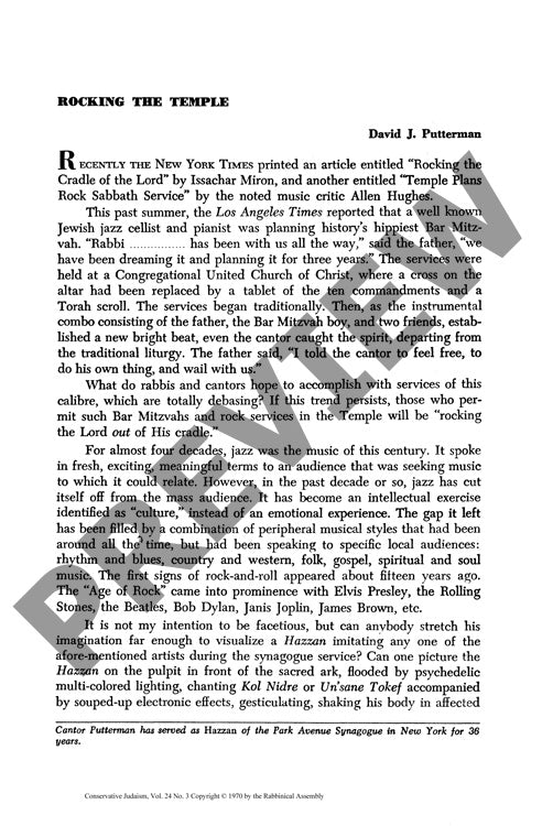 Rock music's integration into Jewish religious services during the late 1960s sparked intense debate over the boundaries between innovation and tradition in sacred spaces. Drawing on contemporary newspaper reports and firsthand observations, Cantor David J. Putterman of Park Avenue Synagogue challenges the compatibility of rock's "harsh beat and raucous sounds" with Jewish worship's fundamental requirements of prayer, serenity, and meditation. Through comparative analysis of specific cases—including a jazz-influenced Bar Mitzvah service at a Congregational United Church where traditional elements were replaced with contemporary arrangements—Putterman contrasts these controversial adaptations with established practices of liturgical innovation. His analysis references Park Avenue Synagogue's 25-year commissioning program, which engaged 64 composers including Leonard Bernstein, Ernest Bloch, and Kurt Weill, as a model for thoughtful musical evolution. While contemporary musical elements can meaningfully enhance Jewish services, they must maintain spiritual and aesthetic integrity rather than pursuing novelty for its own sake. The findings demonstrate that successful liturgical innovation interprets and enhances sacred texts while preserving worship's sanctity, drawing a clear line between authentic religious expression and mere entertainment.