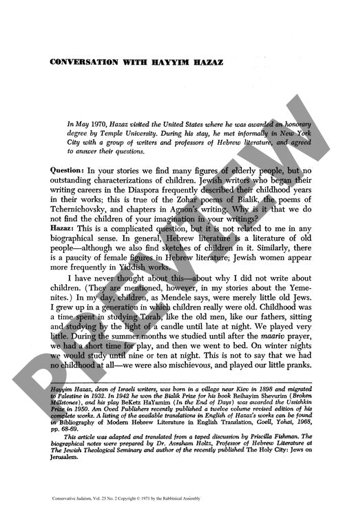 Prominent Israeli author Hayyim Hazaz's artistic philosophy and creative process emerge vividly in a newly translated 1970 interview conducted during his visit to receive an honorary degree from Temple University. Through informal discussions with Hebrew literature scholars and writers in New York City, Hazaz revealed his deliberate exclusion of childhood narratives, explaining how his generation experienced youth not through play but as "little old Jews" immersed in Torah study. The interview illuminates his meticulous revision process, particularly evident in his twelve-volume collected works, where he strategically removed complex kabbalistic and Arabic elements from Yemenite stories to increase reader accessibility while maintaining narrative integrity. Rather than portraying specific individuals, Hazaz crafted composite characters drawn from multiple sources, as demonstrated in "Shackled Together," reflecting his sophisticated artistic methodology. His work ultimately explores the fundamental tension between exile (galut) and redemption (geulah) in Jewish consciousness, positioning him within the ideologically-driven tradition of Hebrew literature alongside Bialik and Mendele.