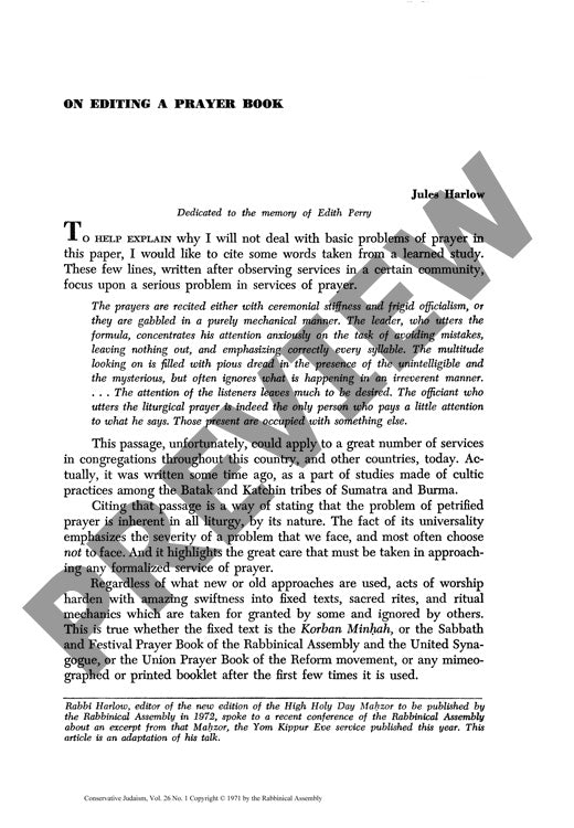Prayer books risk becoming spiritual fossils - repositories of mechanically recited words rather than vessels of living worship. Drawing from his experience editing the Rabbinical Assembly's High Holy Day Mahzor, Harlow explores how innovative design and careful translation can reanimate Jewish liturgical texts for contemporary congregants. The project employed strategic two-color printing (black and purple) to distinguish liturgical elements and enhance visual navigation, while modernizing archaic English translations without compromising theological accuracy. By integrating historical and contemporary sources, including newly discovered medieval liturgical poetry, the editorial process revealed an unexpected finding: ancient and medieval texts often resonated more powerfully than modern compositions. The methodology balanced aesthetic considerations, scholarly research, and practical worship needs, developing solutions like color-coded Sabbath passages and seamlessly integrated devotional commentary. Through collaborative relationships with modern composers and writers, the project achieved its core aim: preserving authentic Jewish liturgical tradition while making it accessible to modern worshippers, many of whom lack Hebrew fluency and struggle with traditional prayer forms. The findings offer broader insights into maintaining spiritual vitality within formalized religious practice.