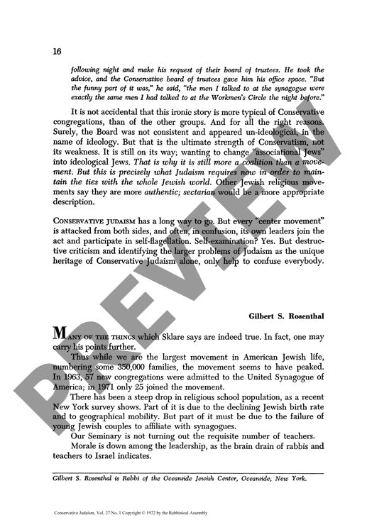 Conservative Judaism's centrist approach to American Jewish life stood at a crossroads in the early 1970s, facing declining morale and institutional weakness even as it pioneered influential educational and cultural innovations. Quantitative indicators revealed concerning trends: stagnating congregational growth, sharp drops in religious school enrollment, and increasing leadership migration to Israel. The movement's reluctance to establish and enforce clear halakhic standards left many congregations with observance levels barely distinguishable from Reform Judaism, undermining its distinctive identity. Statistical analysis of membership patterns, combined with theological assessment of the movement's positioning strategy, revealed both structural vulnerabilities and untapped potential. Despite these challenges, Conservative Judaism achieved notable successes through innovative worship patterns, educational revival, Hebrew camping programs, and advancement of Jewish peoplehood concepts. Strategic reforms emerged as critical priorities: theological reformulation, stricter clerical and lay standards, continued halakhic development, and expanded experiential programming through day schools and immersive Jewish living. While the movement confronted challenges common to all American Jewish denominations, its centrist philosophy remained viable for meaningful Jewish continuity - provided it could successfully restructure and reconnect with its core principles.