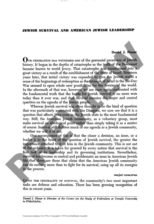 In the decades following the Holocaust, Jewish survival emerged as the central organizing force reshaping American Jewish communal life and leadership structures. Through historical analysis and institutional assessment, Elazar traces how existential concerns transformed decision-making hierarchies and organizational priorities within American Jewish communities from 1945 through the early 1970s. Defense and education became paramount survival tasks, with Israel advocacy gaining prominence after the 1967 Six-Day War. This shift elevated federation and United Jewish Appeal leaders who championed Israel's cause, while traditional social service directors saw their influence decline as their institutions grew increasingly secular. Centralized fundraising mechanisms proved crucial in determining organizational power dynamics, allowing federations to extend their influence across multiple domains of Jewish life. While Israel has become the cardinal principle of contemporary American Jewish identity, the research suggests this foundation alone may be insufficient for sustaining vibrant Jewish communities without reconnecting to sacred traditions and spiritual purposes.