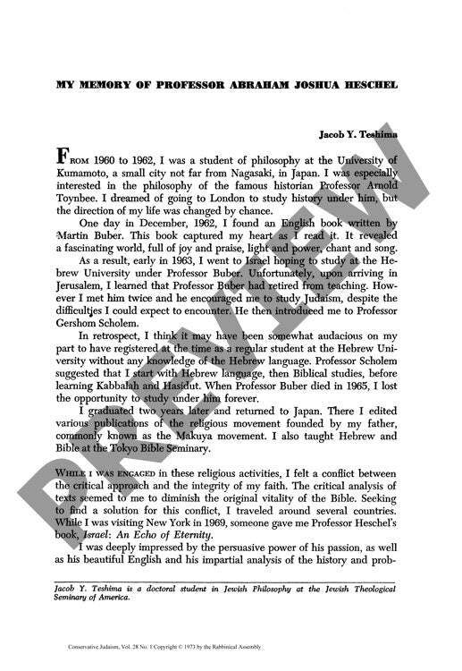 This personal memoir examines the philosophical and spiritual influence of Professor Abraham Joshua Heschel on a Japanese doctoral student through direct observation and study from 1970 to 1972. The author employs autobiographical narrative methodology to document his intellectual journey from studying philosophy in Japan, through encounters with Martin Buber and Gershom Scholem in Israel, to his eventual mentorship under Heschel at the Jewish Theological Seminary. The study reveals Heschel's distinctive approach to reconciling critical scholarship with religious faith, particularly his ability to maintain biblical vitality while engaging in rigorous textual analysis. Through detailed accounts of personal conversations, walks, and philosophical discussions conducted in Hebrew, the research illuminates Heschel's integration of social activism with theological conviction, demonstrating how his political positions on issues including the Vietnam War and civil rights emerged from biblical and Torah-based foundations rather than secular liberalism. The findings indicate that Heschel's pedagogical method emphasized prophetic tradition, combining intellectual rigor with compassionate engagement with contemporary social issues. The author concludes that Heschel embodied a unique synthesis of scholarly excellence and spiritual authenticity, representing what he terms "divine compassion" manifested through persistent advocacy for peace, justice, and redemption in both academic and public spheres.