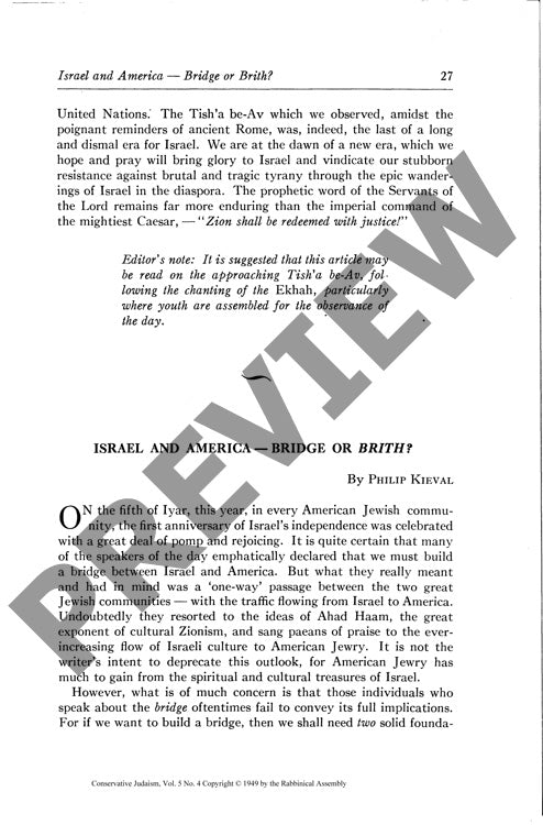 In 1948, as the newly independent State of Israel emerged, a fundamental tension arose between American and Israeli Jewish communities over their future relationship. Rather than viewing America merely as a "bridge" to support Israel, the two communities needed a reciprocal "covenant" (brith) to ensure meaningful Jewish continuity. Through participant observation during 1947-48 in Israel, including ethnographic studies at sites like Kibbutz Mayan Baruch, a stark religious dichotomy emerged between rigid Orthodoxy and complete secularism, with no middle ground for alternative Jewish expression. American Jewry, particularly through Conservative Judaism's religious flexibility and engagement with universal intellectual currents, offered vital alternatives to this binary paradigm. Qualitative research revealed that American Jewish communities could help prevent excessive particularism in Israeli society while contributing innovative religious approaches. These findings demonstrate that sustaining Jewish continuity requires bidirectional cultural exchange, with American Jews offering religious innovation and cosmopolitan perspectives to complement Israel's spiritual contributions, thereby establishing a true covenant between the world's two largest Jewish populations.