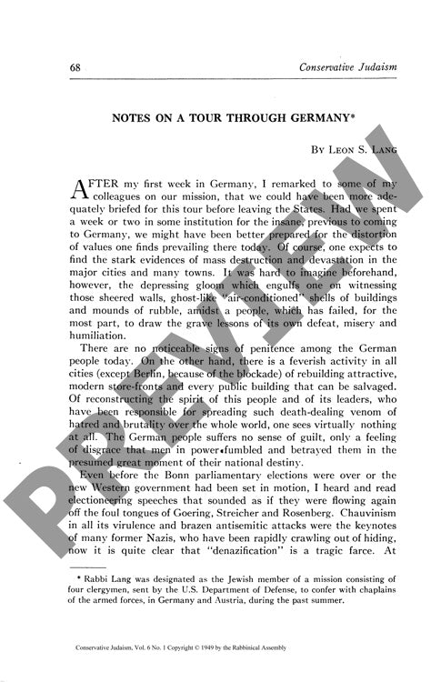 In 1949, just four years after the Holocaust, Germany's physical ruins masked an even deeper spiritual devastation - one marked by a striking absence of penitence and the persistence of antisemitism. Through firsthand observations and interviews conducted during a U.S. Department of Defense clergy mission, Rabbi Leon S. Lang documented disturbing evidence of failed denazification efforts, including the commercialization of mass grave sites at Dachau. His ethnographic research revealed widespread German rejection of culpability alongside the precarious state of surviving Jewish communities, who faced severe shortages of religious leadership and accelerating emigration to Israel. While restitution programs existed, their implementation proved restrictive and inadequate, with limited governmental support. The investigation concluded that Germany offered neither peace nor security for its remaining Jewish residents, warranting urgent international support for resettlement in Israel. Lang's findings pointed to a virtually non-existent spiritual reconstruction of German society, raising serious concerns about the prospects for Jewish-German reconciliation and the long-term implications for post-war healing.