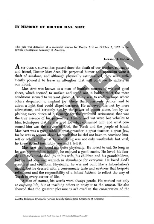 This memorial address delivered by Chancellor Gerson D. Cohen at the Jewish Theological Seminary of America commemorates the life and contributions of Doctor Max Arzt (1897-1975), a distinguished rabbi, educator, and administrator. Through biographical narrative and personal testimony, Cohen examines Arzt's multifaceted career spanning congregational leadership, Seminary administration, and scholarly pursuits. The methodology employed is primarily eulogistic discourse, drawing upon personal anecdotes, professional observations, and textual analysis of Arzt's writings. Key findings reveal Arzt's distinctive approach to Jewish education and spiritual leadership, characterized by his integration of humor and profound religious commitment, his dedication to making classical Jewish texts accessible through midrashic interpretation, and his elevation of mundane administrative tasks to sacred missions. The study highlights Arzt's scholarly contributions, including his work on Midrash Tehilim manuscripts and his commentary "Justice and Mercy" on High Holy Day liturgy, as well as his participation in the Jewish Publication Society's Bible translation project. Cohen concludes that Arzt exemplified the synthesis of practical rabbinical service with serious scholarship, demonstrating how individual dedication to Torah and community service can sanctify both personal and professional endeavors. The address positions Arzt as a model of religious authenticity who maintained spiritual purpose throughout diverse roles as congregational rabbi, fundraiser, teacher, and counselor.