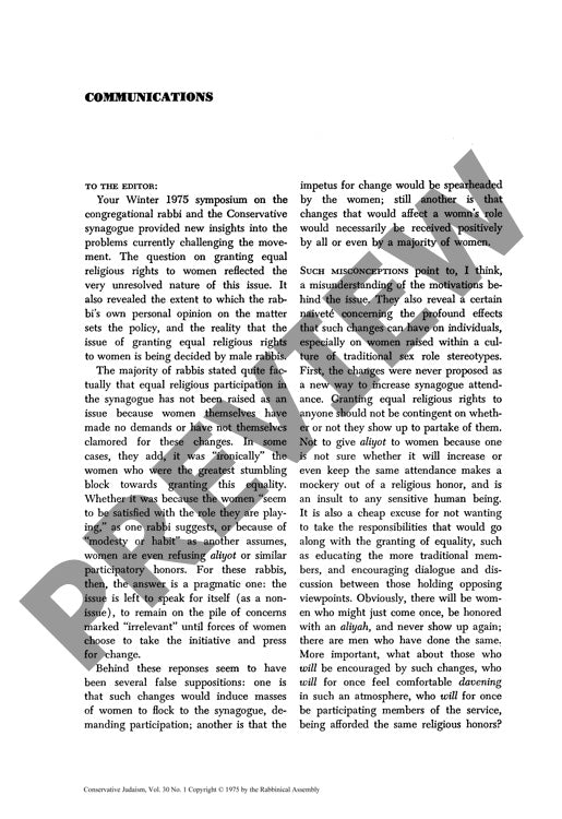 Male Conservative rabbis in 1975 justified denying women equal religious rights by claiming women themselves resisted change - a justification that masked deeper institutional barriers to gender equality in Judaism. When surveyed about congregational policies, these rabbis reported that women rarely demanded expanded roles and often actively opposed modifications to traditional practice. Through textual analysis of rabbinical responses and historical parallels of resistance to social change, this research exposes several flawed assumptions: that equality would dramatically increase female synagogue attendance, that women would universally embrace new religious roles, and that lack of explicit demands indicated genuine satisfaction with inequality. The methodology examines both stated rationales and unstated biases in the symposium responses, revealing how rabbis adopted pragmatic deferrals of change or invoked Orthodox tradition to maintain exclusionary practices. Women's apparent acceptance of limited religious roles reflected psychological investment in familiar traditions rather than authentic preference - a pattern seen in other contexts of institutional discrimination. True religious equality requires providing choice regardless of utilization rates, particularly given Conservative Judaism's foundational commitment to evolutionary change. This analysis demonstrates how traditionalist resistance to women's religious equality fundamentally contradicted Conservative Judaism's adaptive principles.