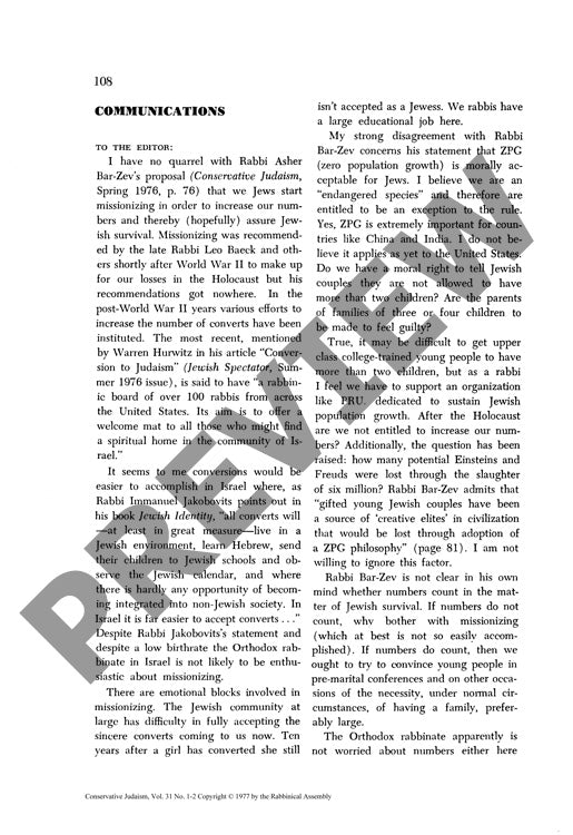 This scholarly discourse examines contemporary debates regarding Jewish demographic survival and religious revitalization through three primary communication threads. The study analyzes rabbinical perspectives on zero population growth (ZPG) policies and their implications for Jewish communities in the post-Holocaust era. The first thread presents opposing viewpoints on missionizing as a demographic strategy, with one position advocating for Jewish population growth as an "endangered species" exception to ZPG principles, while acknowledging practical and emotional barriers to conversion acceptance within Jewish communities. The second communication proposes intensive Jewish education reform as an alternative to demographic solutions, arguing that spiritual engagement through authentic textual analysis rather than superficial religious exposure can address assimilation concerns. The final thread contributes to theological discourse by advocating for integration between Jewish mysticism and neo-classical metaphysics, specifically referencing Charles Hartshorne's process theology as compatible with Jewish mystical insights. Additionally, the discourse includes historical corrections regarding the development of the Central Jewish Institute and its educational leadership. The findings suggest that Jewish survival strategies require multifaceted approaches encompassing demographic, educational, and theological dimensions, while revealing significant disagreement among religious leaders regarding prioritization of quantitative versus qualitative community development approaches.
