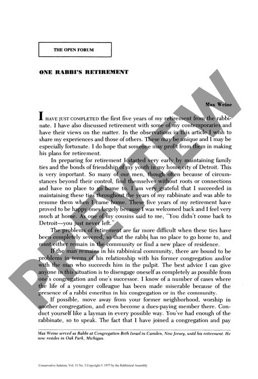 After five years of retirement from the Conservative rabbinate, profound challenges and opportunities emerge that reshape a religious leader's identity and community relationships. Drawing from personal reflections and in-depth discussions with contemporary retired rabbis, this experiential analysis reveals how maintaining pre-existing family and hometown connections becomes crucial for successful transition to post-rabbinical life. The research highlights particular tensions when retired clergy remain in their former congregational communities, especially regarding relationships with successors and ongoing congregational dynamics. Early preparation and complete disengagement from former rabbinical duties prove essential, with retired rabbis benefiting from joining different congregations as lay members and avoiding unsolicited involvement in their previous roles. Beyond the social and professional dimensions, the analysis addresses practical considerations including estate planning - notably the disposition of rabbinical libraries - and the often overlooked vulnerable position of rabbis' widows within congregational structures. Success in rabbinical retirement ultimately demands deliberate preparation, development of non-rabbinical pursuits, and clear boundaries between past and present roles. These insights contribute to understanding professional transition challenges specific to religious leadership while offering practical guidance for retirement planning within the Conservative rabbinical community.