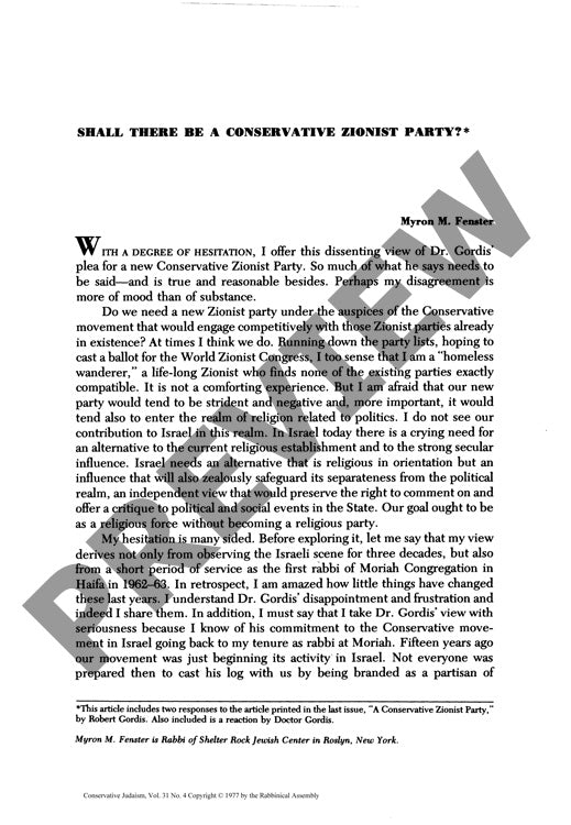 The establishment of a Conservative Zionist political party in Israel sparked intense debate among Jewish religious leaders in the 1960s, revealing fundamental tensions between religious autonomy and political necessity. Three prominent voices emerged: Rabbi Myron M. Fenster, drawing from his leadership of Moriah Congregation in Haifa (1962-63), opposed Dr. Robert Gordis' proposal for a Conservative political party despite acknowledging the movement's challenges of lacking governmental recognition, subsidies, and official status. Fenster advocated maintaining Conservative Judaism as an independent religious force focused on teaching, congregation-building, and religious voluntarism rather than entering political competition. Jacob Stein raised practical concerns about MERKAZ (Movement for the Reaffirmation of Conservative Zionism), questioning the wisdom of creating another Zionist organization when existing structures served similar purposes and warning against fragmenting unified Jewish support for Israel. Dr. Gordis countered that political engagement had become necessary given the growing Orthodox religious monopoly in Israel, asserting that Conservative Judaism must actively pursue equal religious expression rather than accept marginalization. Their interchange illuminates the broader conflict between idealistic separation of religion and politics versus pragmatic responses to religious discrimination in Israeli society.