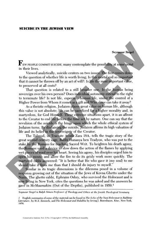 Judaism's complex relationship with suicide reflects a delicate balance between divine law and human compassion. Through analysis of classical rabbinic sources, Talmudic texts, and halakhic literature, a nuanced religious framework emerges - one that fundamentally condemns suicide as an affront to divine sovereignty while extending understanding to those in extreme distress. The research examines primary sources including the Talmud, Midrash, and responsa literature, with particular focus on cases from the Holocaust period. While Judaism views life as a divine gift that only the Creator may reclaim, rabbinic authorities distinguish between willful suicide (me'abed et atsmo l'da'at) and acts of self-destruction committed under duress, mental illness, or extreme circumstances. Biblical cases like King Saul's death are interpreted as martyrdom to prevent forced apostasy rather than normative suicide. Over time, rabbinic authorities developed increasingly compassionate interpretations of the legal requirements for determining willful suicide, making the criteria so stringent that virtually all suicide victims receive full burial honors. This evolution in Jewish legal thought demonstrates how the tradition maintains its fundamental valuation of life while acknowledging human suffering, ultimately upholding both divine sovereignty and human dignity within its ethical framework.