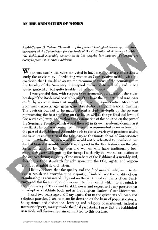 In 1977, as women's roles in religious leadership sparked intense debate across Judaism, the Conservative Movement confronted a watershed decision: whether qualified women could serve as rabbis. The Commission for the Study of the Ordination of Women as Rabbis, chaired by Chancellor Gerson D. Cohen, undertook a comprehensive investigation combining interdisciplinary analysis, North American public hearings, expert testimony, and community surveys. Through examination of halakhic, theological, moral, sociological, and institutional dimensions, the commission scrutinized traditional Jewish legal distinctions between men and women, focusing on issues of communal appointment, Torah study obligations, time-dependent commandments, witness eligibility, and judicial service. While acknowledging certain halakhic sex-role distinctions, the research revealed that the modern rabbinate as an evolved social institution does not fall under direct halakhic prohibition regarding women's ordination. The commission found particular support in previous Conservative Movement decisions through the Committee on Jewish Law and Standards, which had already legitimated related practices for women. Drawing on historical precedents of halakhic development and the movement's commitment to Torah scholarship regardless of gender, the majority recommended ordaining qualified women as rabbis. This landmark study concluded that women's ordination would strengthen the Conservative Movement while maintaining both halakhic authenticity and traditional Jewish values.