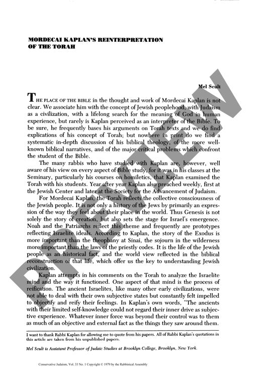 Mordecai Kaplan revolutionized biblical interpretation by reimagining the Torah as an expression of Jewish collective consciousness rather than mere historical narrative. Drawing from his unpublished papers, Seminary lectures, and homiletical works, this research illuminates Kaplan's distinctive hermeneutical approach centered on two key principles: reification, where ancient Israelites transformed subjective spiritual experiences into external divine entities, and temporal projection, whereby ideals were retroactively attributed to patriarchal figures. Through a naturalistic technique of "reversal," Kaplan transformed supernatural entities into descriptive qualities of human experience, prioritizing Israel's wilderness experience and communal narrative over legal codes to frame the Torah as a "spiritual odyssey of a whole people." Unlike contemporary archaeological-based biblical scholarship, his methodology relied on textual analysis, scientific knowledge, and intuitive interpretation. While this approach, rooted in older traditions of biblical scholarship, risks subjective projection, it offers valuable insights into ancient Israelite consciousness and provides a theological framework particularly useful for homiletical applications and contemporary religious engagement with biblical texts.